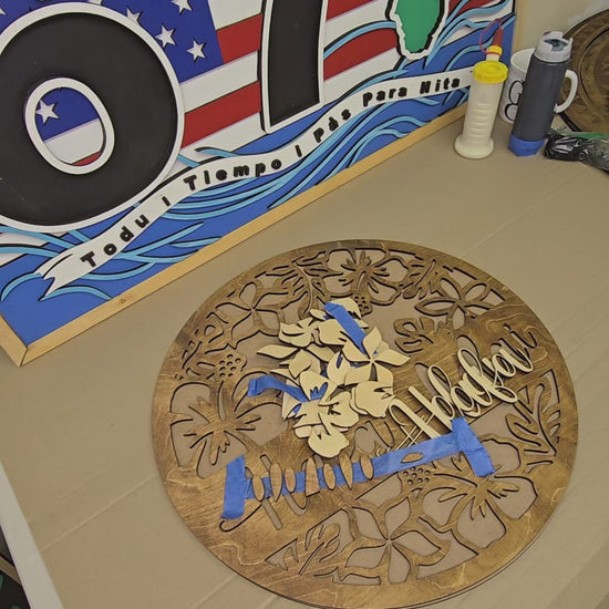 Welcome guests with this handcrafted sign featuring a rich black backdrop, layered natural wood hibiscus accents, and a warm island feel. Each piece is laser-cut, laser-detailed, and finished with care in our veteran-owned shop. Perfect for island homes, gifts, or a tropical vibe anywhere.
